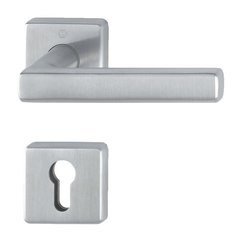 Edelstahl-Feuerschutz-Rosetten-Türgriff-Garnitur mit PZ Schlüsselrosetten für Innentüren · geprüft nach DIN 18273 und DIN EN 1906: 47-D1150A und PIVCERTPlus (1.000.000 Prüfzyklen) · Objekt-Garnitur (Gebrauchskategorie 4) · Lagerung: Türgriffe fest/drehbar, Rückholfedern · HOPPE-Steckgriff-Verbindung mit Kugel-Arretierung Sertos® · wartungsfreie Gleitlager · Verbindung: HOPPE-Profilvollstift 9 mm · Unterkonstruktion: Stahl · Stütznocken · Befestigung: verdeckt, durchgehend, Gewindeschrauben M4 · Lochung PZ · DIN links / rechts verwendbarWeitere technische Eigenschaften:· Ergänzung: D/D· Lagerung: fest-drehbar-gelagert· Vierkant: 9mm