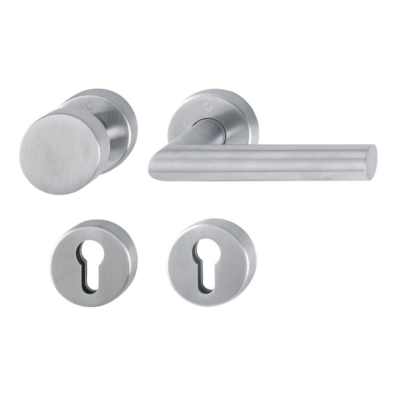 Edelstahl-Feuerschutz-Rosetten-Garnitur mit Schlüsselrosetten für Innentüren / Wohnungsabschlusstüren · geprüft nach DIN 18273 und DIN EN 1906: 47-D1150A und PIVCERTPlus (1.000.000 Prüfzyklen), Objekt-Garnitur (Gebrauchskategorie 4) · Lagerung: Türgriffe fest/drehbar (Wechselgarnitur: außen Knopf fest), Rückholfedern, HOPPE-Steckgriff-Verbindung mit Kugel-Arretierung Sertos®, wartungsfreie Gleitlager · Verbindung: HOPPE-Profilvollstift / HOPPE-FDW-Profilvollstift (Wechselgrt.) · Unterkonstruktion: Stahl, Stütznocken · Befestigung: verdeckt, durchgehend, Gewindeschrauben M4Weitere technische Eigenschaften:· Ergänzung: D/K· Lagerung: fest-drehbar-gelagert· Vierkant: 9mm