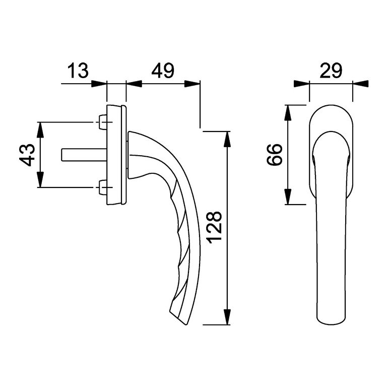 nach RAL-RG 607/9 · federnd gelagerte, drehbare Abdeckkappe · Kunststoff Rosette mit Stütznocken 10 mm · 7 mm Vollstift · Seitenrastung mit positionsgenauer RaststellungWeitere technische Eigenschaften:· Grifflänge: 128mm· Nocken-Ø: 10mm· Lochabstand: 43mm· Sockelstärke: 13mm· Vierkant: 7mm