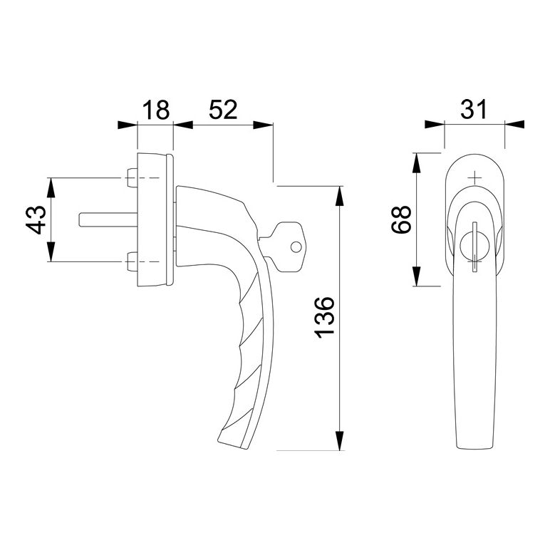 Dreh-/Kipp-Fenstergriff mit Secu100® + Secustik® und VarioFit®, abschließbar · geprüft nach DIN EN 13126-3: 23/180-0132/33/C1 und RAL-GZ 607/9, RAL100 · erfüllt die Anforderungen nach DIN EN 1627-1630 RC1-6 · Schließung: Druckzylinder, Wendeschlüssel, H001-EW · Rastung: 90° · Abdeckung: Teil-Abdeckkappe · Unterkonstruktion: Kunststoff, Stütznocken · Stift: HOPPE-Vollstift, 10 mm Längenvarianz, stufenlose Anpassung durch integrierte Druckfeder im Griffhals · Befestigung: verdeckt, Gewindeschrauben M5 · Besonderheit: integrierte Basis-SicherheitWeitere technische Eigenschaften:· Grifflänge: 136mm· Nocken-Ø: 10mm· Lochabstand: 43mm· Sockelstärke: 18mm· Vierkant: 7mm