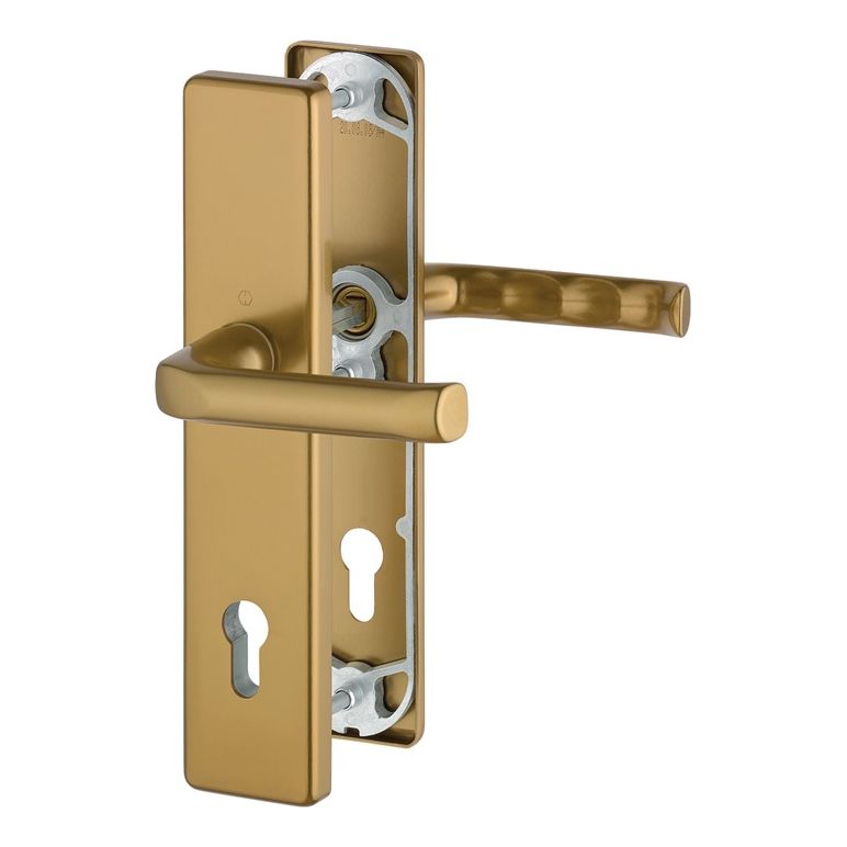 Drückergarnitur für Abschlusstüren · mit Teilstahleinlage als Anbohrschutz · Knopfschild-Randhöhe: 12 mm · mit 3-facher sichtbarer Verschraubung · mit Stahl-Nocken · Lochung PZ · DIN links / rechts · Widerstandsklasse ES 0Weitere technische Eigenschaften:· Breite: 54mm· Länge: 250mm· Abdeckung: ohne Zylinderabdeckung· Schildstärke: 12 mm