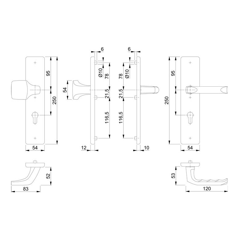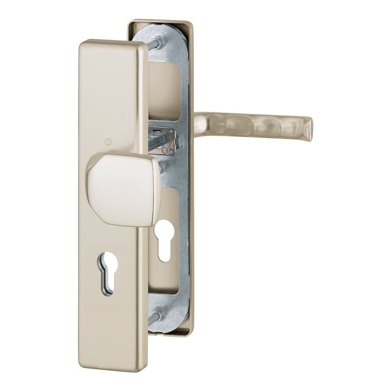 für Abschlusstüren · einbruchhemmend nach DIN 18257 · Knopfschild-Randhöhe: 12 mm · mit Rückholfeder-Paket (bei 8 mm Vierkant / NICHT bei 10 mm) · Wechselgarnitur mit gekröpftem Knopf lt. Abb. · FDW-Profilstift-Verbindung · DIN links / rechts verwendbar · Befestigung: verdeckt, durchgehend, Gewindeschrauben M6 · Lochung PZ · einschließlich Befestigungsmaterial · Widerstandsklasse ES 1 · Unterkonstruktion: außen Stahl, innen Aluminium, StütznockenWeitere technische Eigenschaften:· Breite: 54mm· Länge: 250mm· Abdeckung: ohne Zylinderabdeckung· Schildstärke: 12 mm