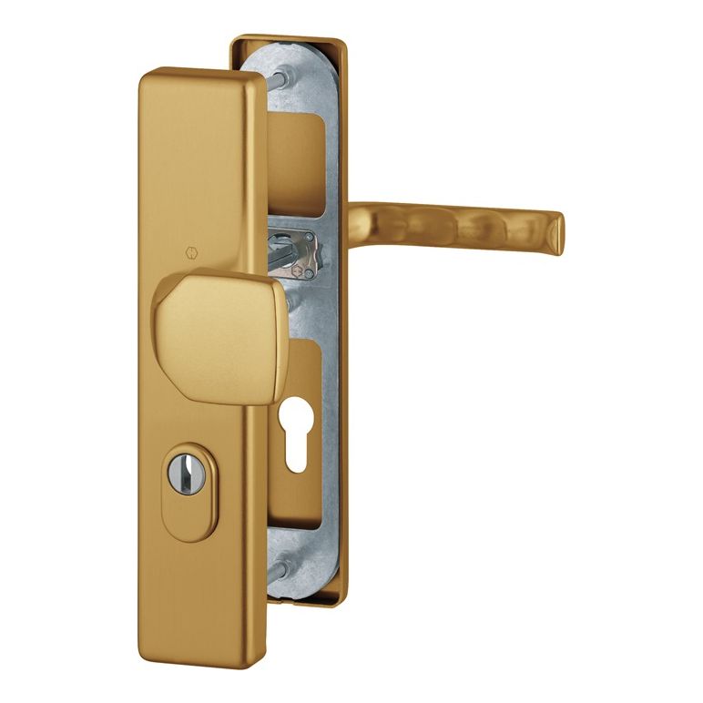 für Abschlusstüren mit ZA · geprüft nach DIN 18257 · Unterkonstruktion: außen Stahl, innen Aluminium, Stütznocken · Wechselgarnituren mit gekröpftem Knopf · Zylinderabdeckung: gehärteter Stahl, für vorstehende Zylinderlänge 10-18 mm · HOPPE FDW Profilstift-Verbindung · Lochung PZ · Widerstandsklasse ES 1 · Befestigung: verdeckt, durchgehend, Gewindeschrauben M6Weitere technische Eigenschaften:· Breite: 54mm· Länge: 250mm· Abdeckung: mit Zylinderabdeckung· Schildstärke: 15 mm