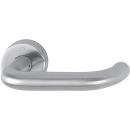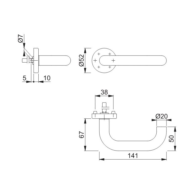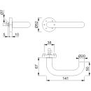 Edelstahl-Rosetten-Türgriff-Halbgarnitur mit Rosetten-Montagemodul, ohne Schlüsselrosette, für Außentüren (Innenseite)· Lagerung: Türgriff lose, Rückholfeder rechts/links verwendbar, wartungsfreies Gleitlager · Verbindung: Schnellstift-Verbindung mit Vollstift, vormontiert in der Unterkonstruktion · Unterkonstruktion: Stahl, Stütznocken, für Aluminium-, Holz- und Kunststofftüren · Befestigung: verdeckt, zusätzliche 4-fach diagonale Befestigungsmöglichkeit, für MehrzweckschraubenWeitere technische Eigenschaften:· Drückerlänge: 141mm· Drückertiefe: 67mm