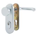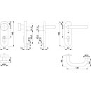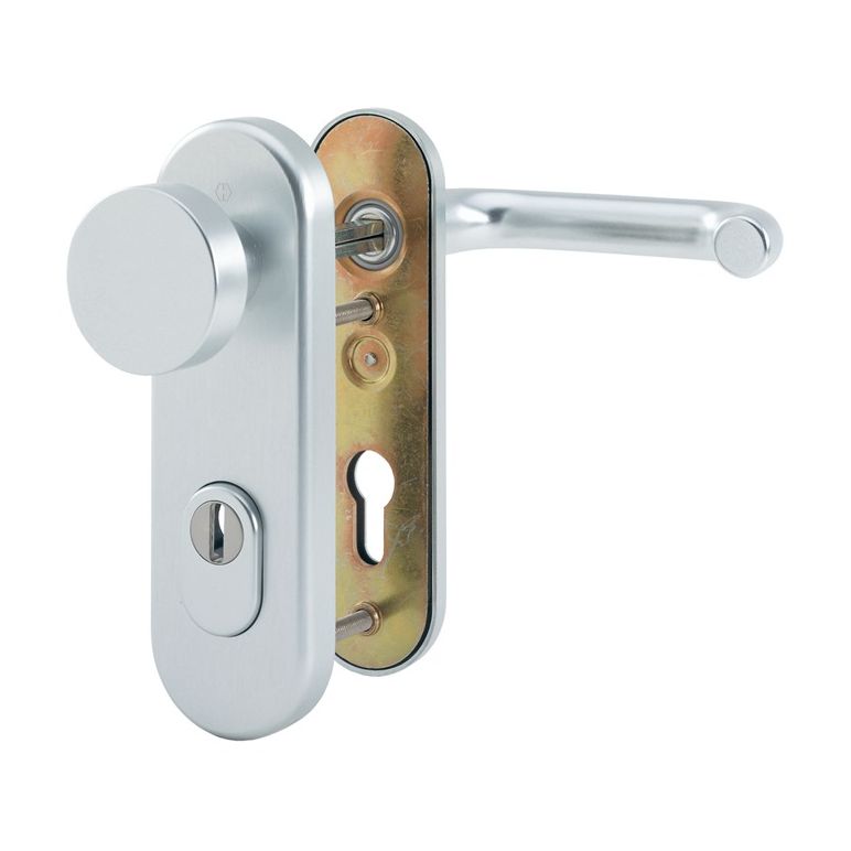 Aluminium-Feuerschutz-Kurzschild-Wechsel-Garnitur mit Zylinder-Abdeckung für Außen-/Wohnungsabschluss-Türen · geprüft nach DIN 18257, DIN 18273 und mitgeprüft in Notausgangsverschlüssen nach DIN EN 179 · Drückerlänge 141 mm, in U-Form · mit Zylinderabdeckung · Stahl-Unterkonstruktion im Außen- und Innenschild · fest / drehbar gelagert im wartungsfreien Gleitlager · mit HOPPE-FDW-Profilvollstift 9 mm · Außenschild: Länge 170 mm, Breite 54 mm · Innenschild: Länge 166, Breite 45 mm · bei Wechselgarnitur Außenseite mit feststehendem Knopf 50 mm Ø · Knopfschildrandstärke 12 mm · Lochung PZ · Entfernung 72 mm · hochfeste, verdeckte Verschraubung · DIN links / rechts verwendbarWeitere technische Eigenschaften:· Ergänzung: D/K· Widerstandsklasse: ES 1· Lagerung: fest-drehbar-gelagert· Vierkant: 9mm