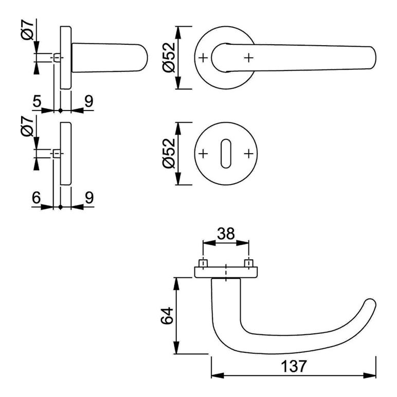 Innentür-Rosetten-Garnitur nach DIN EN 1906 (Gebrauchs-Kategorie Klasse 3) · Türgriffe mit Schnellstift-Verbindung (mit 8 mm Vollstift) für Türstärke 37 - 42 mm · Rosette mit Kunststoff-Unterkonstruktion, Rückholfeder und Stütznocken · Befestigung verdeckt, durchgehend · wechselseitig inkl. Mehrzweckschrauben · Anschlagrichtung DIN links / rechtsWeitere technische Eigenschaften:· Befestigungssystem: Schnellstift· Nockenabstand: 38mm