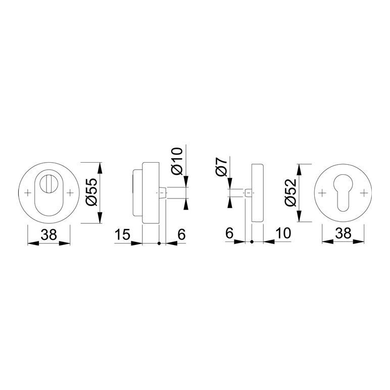 Edelstahl-Schutz-Schlüsselrosetten-Paar für Außentüren · Unterkonstruktion: außen Zamak, innen Stahl, Stütznocken · Befestigung: verdeckt, durchgehend, Gewindeschrauben M5 · Stärke 15 mm · Ø 55 mm · Lochung PZ · für Türstärke 57-62 mm + 67-72 mmVariante mit Zylinderabdeckung: Stahl, für vorstehende Zylinderlänge 10-18 mmWeitere technische Eigenschaften:· Lochung: PZ