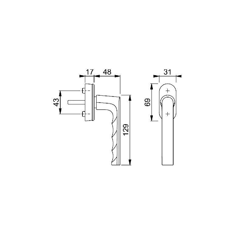 Dreh-/Kipp-Fenstergriff mit SecuForte® und VarioFit® · automatische Sperrfunktion in Geschlossen-Stellung (0°) und in Kippstellung (180°) · geprüft nach DIN EN 13126-3: 23/180-0131/13/C1 und RAL-GZ 607/9 · mit längenvariablem 7 mm Vierkantstift · Unterkonstruktion: Kunststoff, Stütznocken 10 mmWeitere technische Eigenschaften:· Grifflänge: 129mm· Nocken-Ø: 10mm· Lochabstand: 43mm· Sockelstärke: 17mm· Vierkant: 7mm