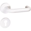 in R-Technik mit Rosetten nach DIN 18255 und DIN EN 1906 aus Polyamid, Oberfläche hochglänzend, bestehend aus: Türdrücker in U-Form aus Polyamid mit durchgehendem Stahlkern bis in das Drückerende, durchgängig eingefärbt, Durchmesser 20 mm, mit Ansatzführung und Rastnut, Montage durch einfaches Einrasten der Türdrücker in die auf der Tür vormontierten Unterteile. Die Rastung kann mittels Demontageschlüssel wieder gelöst werden. Der Drücker erfüllt die Vorgaben der DIN EN 179 und DIN 18040.Rosettenunterkonstruktion in Kunststoff-Edelstahlverbundbau, DIN links und DIN rechts verwendbar. Festdrehbarlagerung der Drücker mit selbsttätig einrastender Rundumverriegelung und 5 mm Lagerstelle als wartungsfreies Gleitlager mit elastischem Ausgleichsbereich und zweiter Lagerstelle im Drückerhals. Verdeckte, lockerungssichere Verschraubung mit M4 Schrauben- und Hülsenschraubenkombination sowie Stützzapfen.Rosetten-Abdeck-Kappe, rund, aus Polyamid durchgängig eingefärbt, Durchmesser 55 mm, 13 mm hoch, gewölbt, 1,5 mm Wandstärke.Ausgelegt und geprüft für den Objektbereich, Gebrauchs-Kategorie nach DIN EN 1906 - Klasse 4 Garnitur mit Vierkantstift 8 mm · für Türstärke 38-48 mm · Drückerlänge 138 mm · DrückergarniturWeitere technische Eigenschaften:· Befestigungssystem: R-Technik· Nockenabstand: 38mm
