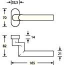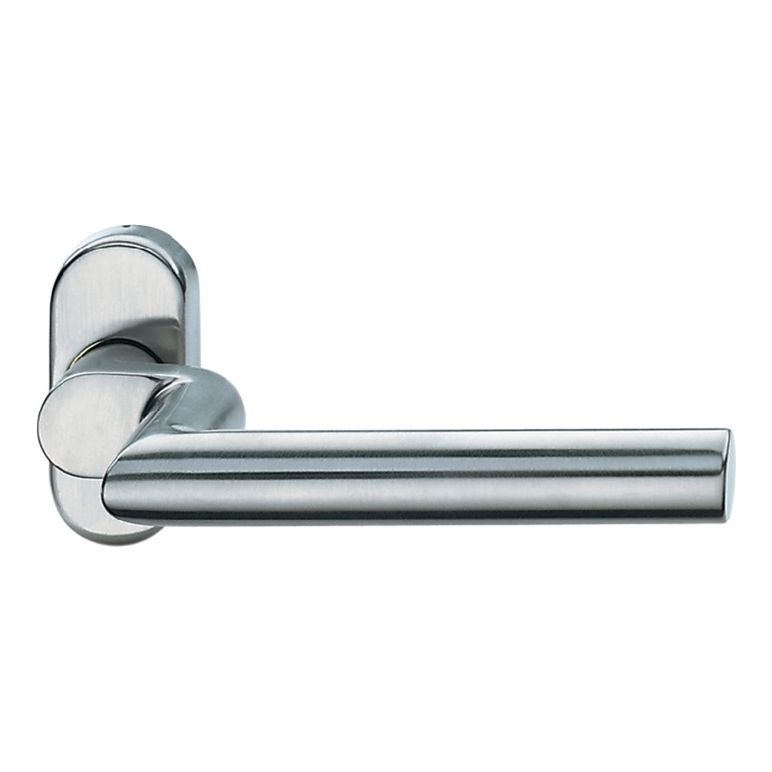 verkröpft · auf ovaler Rosette mit unsichtbarer Befestigung für Senkschrauben M5 (Schraublochabstand 50 mm) mit Hochhaltefeder · mit 8 mm Lochung (Standard-Vierkant) oder 9 mm für Feuer- und Rauchschutztüren · fest/drehbar gelagert - Lieferung ohne Stift und Schrauben -Weitere technische Eigenschaften:· Drückerlänge: 165mm· Typ: Profiltür· Befestigungsart: verdeckte Verschraubung· Drückertiefe: 82mm· Form: oval· Anschlagrichtung: DIN links / rechts· Farb-Nr.: 6204· Norm: DIN 1906· Lagerung: fest-drehbar