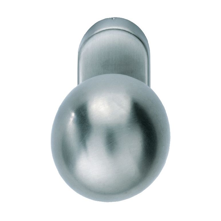 Rahmentür-Kugelknopf gerade, auf ovaler Rosette mit unsichtbarer Befestigung für Senkschrauben M5 (Schraublochabstand 50 mm) mit Hochhaltefeder · mit 8 mm Lochung (Standard-Vierkant) fest/drehbar gelagert oder M12 mm feststehend · DIN links / rechts · Lieferung ohne Stift und SchraubenWeitere technische Eigenschaften:· Befestigungssystem: verdeckte Verschraubung· Anschlagrichtung: DIN links / rechts· Farb-Nr.: 0105· Knopfdurchmesser: 50mm