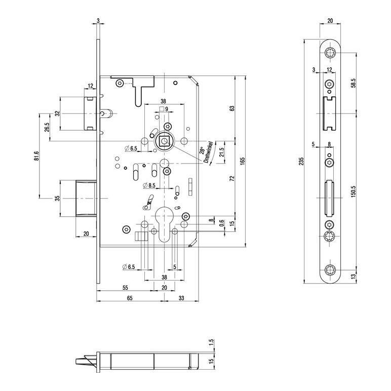 Panik-Einsteckschloss Ser.23 Fkt.B 20/65/72/9mm DIN L VA
