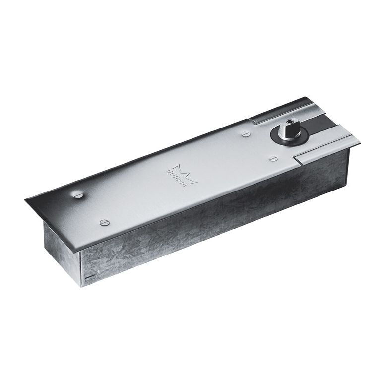 Universal-Bodentürschließer nach EN 1154 · für DIN-links-, DIN-rechts- und Pendeltüren bis 300 kg Türgewicht · mit stufenlos einstellbarer Schließgeschwindigkeit · Schließwirkung ab ca. 175° · mit hydraulisch voll kontrolliertem Schließablauf und Öffnungsdämpfung · mit integriertem Druckausgleich für konstante, stufenlose, von Temperaturschwankungen unabhängige Feststellung zwischen 75° und 175° Türöffnung (abstellbar) · mit stufenlos einstellbarem Feststellbeginn, Schließverzögerung (Verzögerungsende zwischen 75° und 105° einstellbar) · einschließlich Zementkasten Zubehör wie andere Steckachsen und Vergussmasse auf Anfrage
