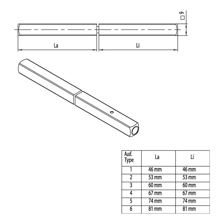 mittig geteilt · Vierkant 9 mm · zum Einsatz an Fluchttüren nach DIN EN 179 · an Brandschutz- und Notausgangstüren dürfen nur geprüfte Beschläge verbaut werden. Darum ist immer der originale Vierkantstift vom Hersteller des Beschlages zu verwenden verwenden!Weitere technische Eigenschaften:· Ausführung: symmetrisch