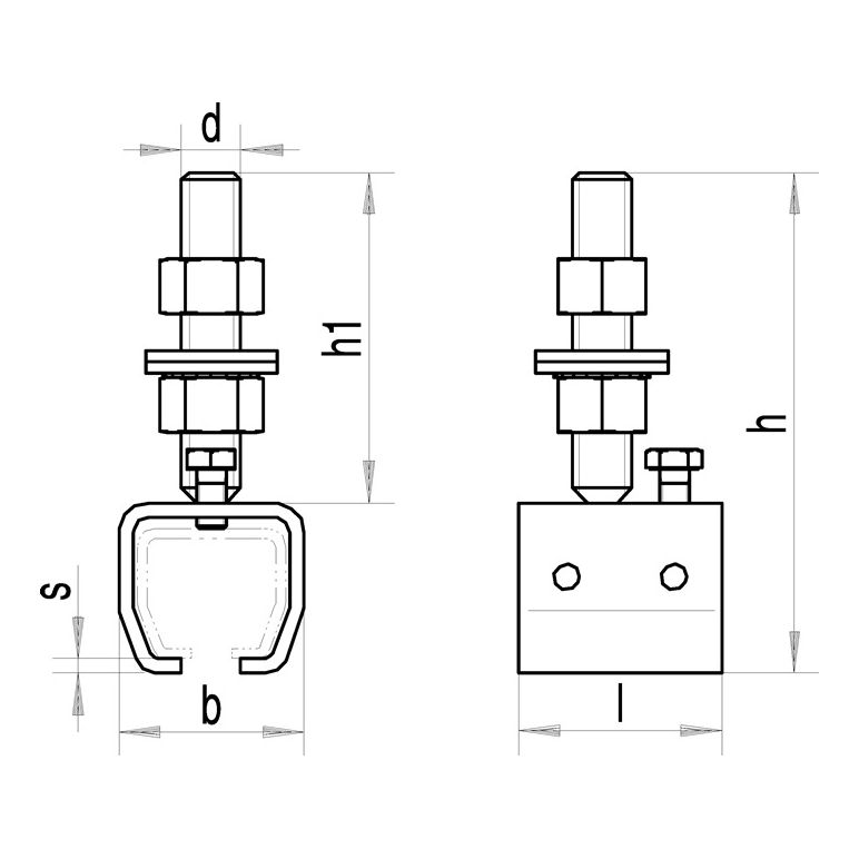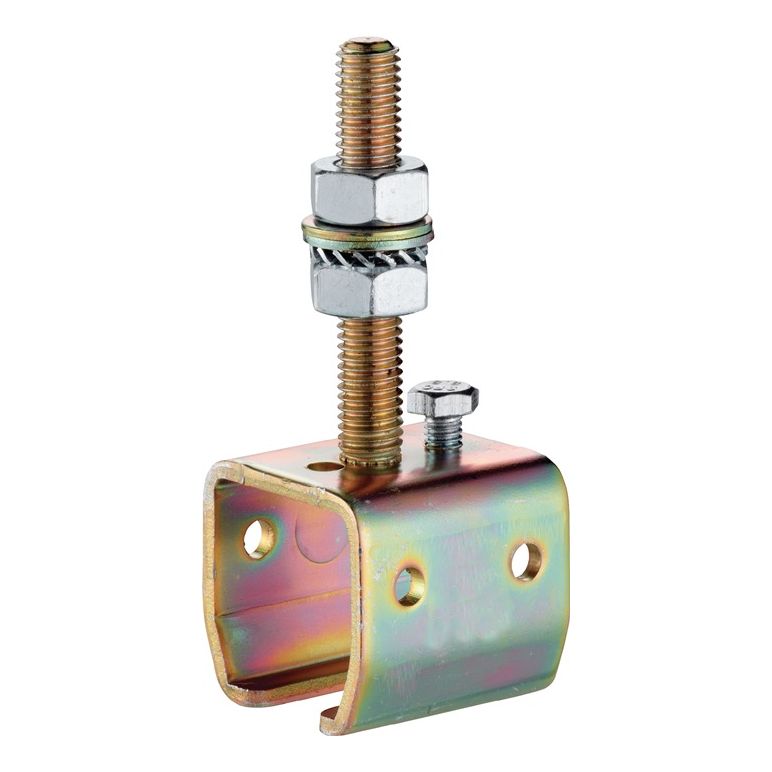 höhenverstellbar · verzinkt, gelb · Schienenhalter mit Niveauausgleich · verwendbar z. B. mit Wandwinkel 04 W oder 04 WDWeitere technische Eigenschaften:· Oberfläche: verzinkt, gelb· d: M16· b: 50mm· h1: 89mm· s: 4mm· l: 55mm· h: 135mm