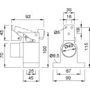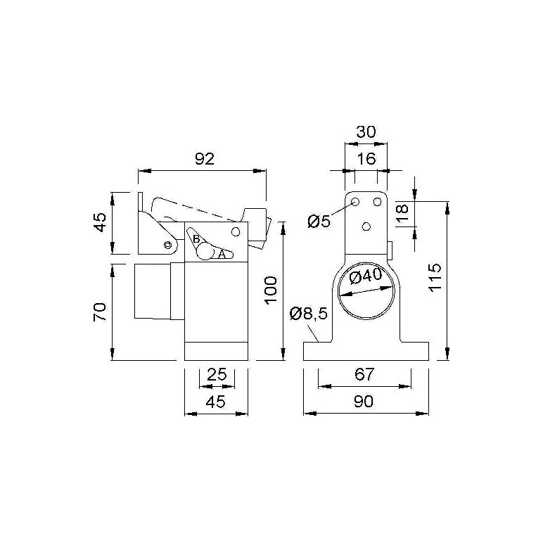 Aluminium, Rollenkloben bei lackierter Oberfläche aus Stahl bzw. bei eloxierter Oberfläche aus Edelstahl · Ausschalthebel zur Aufhebung der Feststellfunktion · zum Aufschrauben · Gummipuffer in schwarz · gefedertVerwendung max. Türgewicht ca. 100 kgFunktion: Zum Arretieren wird die Tür bis zum Einrasten des Fanghakens gegen den Feststeller geführt, Lösen erfolgt durch Betätigen des Fanghakens bei gleichzeitigem Andrücken der Tür gegen den Feststeller. Der Ausschalthebel, von Stellung A nach B (siehe Zeichnung) gebracht, bewirkt ein Aufheben der Arretierung. Der Feststeller hat so nur noch die Funktion eines gefederten Puffers.Weitere technische Eigenschaften:· Breite: 90mm· Länge: 92mm· Tiefe: 92mm· Höhe: 115mm