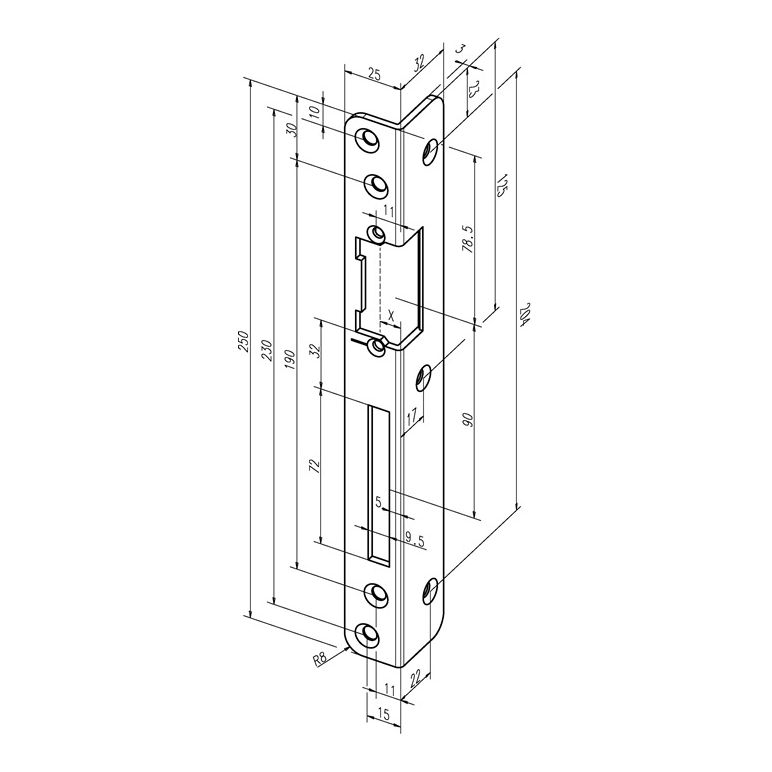 mit Fallen- und Riegelausschnitt · Meterrissmarkierung · 3 mm Materialdicke · mit zusätzlicher Befestigungsbohrung · für gängige eff-eff-Standard-Türöffnermodelle außer ProFix®-VariantenWeitere technische Eigenschaften:· Schließblechausführung: Winkelschließblech· passend für: E-Öffner