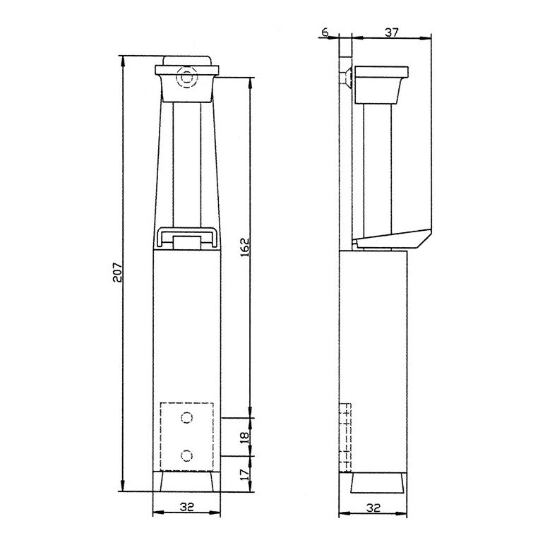 Hub bis 90 mm · Zinkdruckguss silber lackiert · Tretstange und Tretplatte verdrehsicher · Gummipuffer aus Spezialgummi und federnd · Tretstange Stahl galvanisch verzinkt · Tretknopf Kunststoff schwarzWeitere technische Eigenschaften:· Breite: 32mm· Tiefe: 32mm· Höhe: 207mm