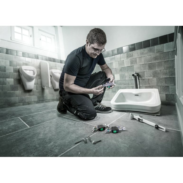 Da die Bauräume bei Schraubarbeiten immer enger werden, sind Werkzeuge notwendig, mit denen die Anwender auch in solchen Situationen erfolgreich arbeiten können. Enge Bauräume erfordern zusätzliche Ansetzpunkte des Werkzeugs. Lassen sich also Maulschlüssel derart modifizieren, dass sich die Ansetzmöglichkeiten des Werkzeugs erhöhen? Durch die Kombination des um 7,5° geschwenkten Mauls und die Doppelsechskantgeometrie wird eine Verdopplung der Ansetzpunkte erzielt. Bei einer wiederholten 180°-Drehung des Schlüssels um die Längsachse während des Schraubens gibt es vier Ansetzmöglichkeiten und Muttern bzw. Schraubenköpfe können alle 15° "gepackt" werden. Der Joker 6003 mit seiner pfiffigen Maulgeometrie erweitert das Anwenderspektrum in engen Bauräumen deutlich. Den jeweiligen Ansetzpunkt findet der Joker 6003 nach jedem Wenden sozusagen von selbst. Die schlanke und dennoch robuste Ringseite ist um 15° zur Werkzeugachse abgewinkelt. Durch die hochwertige Oberflächenvergütung wird ein hoher und lang anhaltender Korrosionsschutz erzielt. Mit Werkzeugfinder Take it easy: Farbkennzeichnung nach Größen. Das verschleißfreie Material des Clips garantiert den sicheren Halt der Maulschlüssel bei gleichzeitiger einfacher Entnahme.