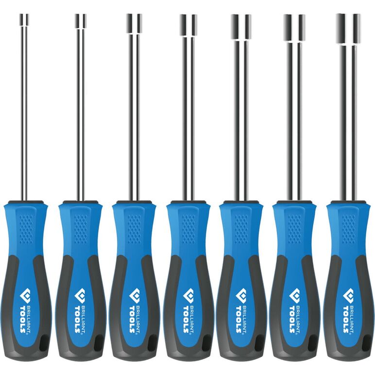 Dieser 7-teilige BRILLIANT TOOLS Stecknuss-Schraubendreher-Satz BT031070 mit Sechskant-Steckschlüsseln von M5 bis M12, eignet sich für vielfältige Schraubarbeiten. Dank der Innenbohrung auch für überstehende Gewindeschäfte. Eine komfortable Handhabung der Werkzeuge bieten die ergonomisch geformten Mehrkomponenten Griffe. Für den langlebigen Einsatz auch bei starker Beanspruchung sind die Werkzeuge aus Chrom-Vanadium-Stahl gefertigt und matt verchromt.
