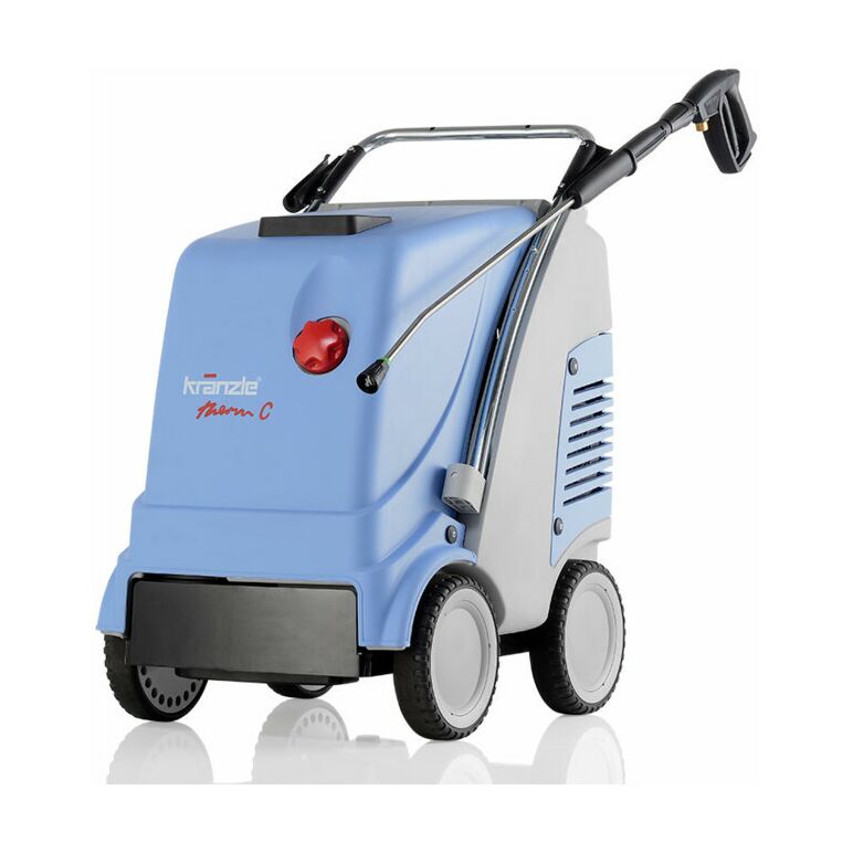 Kompaktes Bauformat, Arbeitsdruck bis zu 180 bar, große Räder mit Vollgummibereifung und Rammschutz vorne und hinten – das zeichnet die therm C Heißwasser-Hochdruckreiniger von Kränzle aus. Diverse Sicherheitseinrichtungen sorgen für einen jederzeit sicheren Betrieb des Hochdruckreinigers. Die Modelle der therm-C-Serie sind mit und ohne Schlauchtrommel erhältlich.