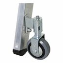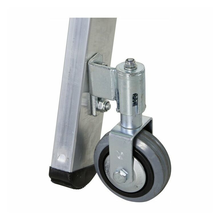 • Sowohl der fahrbare Leiternkopf als auch die Federbremsrollen unten arretieren die Regalleiter bei Belastung