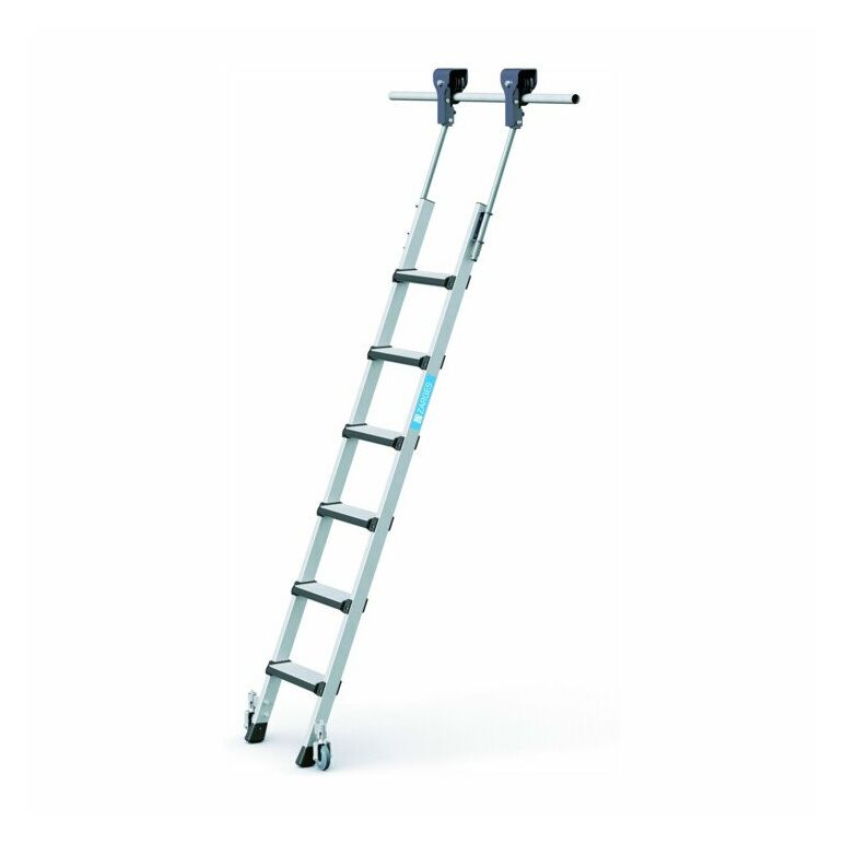 • Im Ruhezustand kann die Leiter platzsparend an das Regal gestellt werden