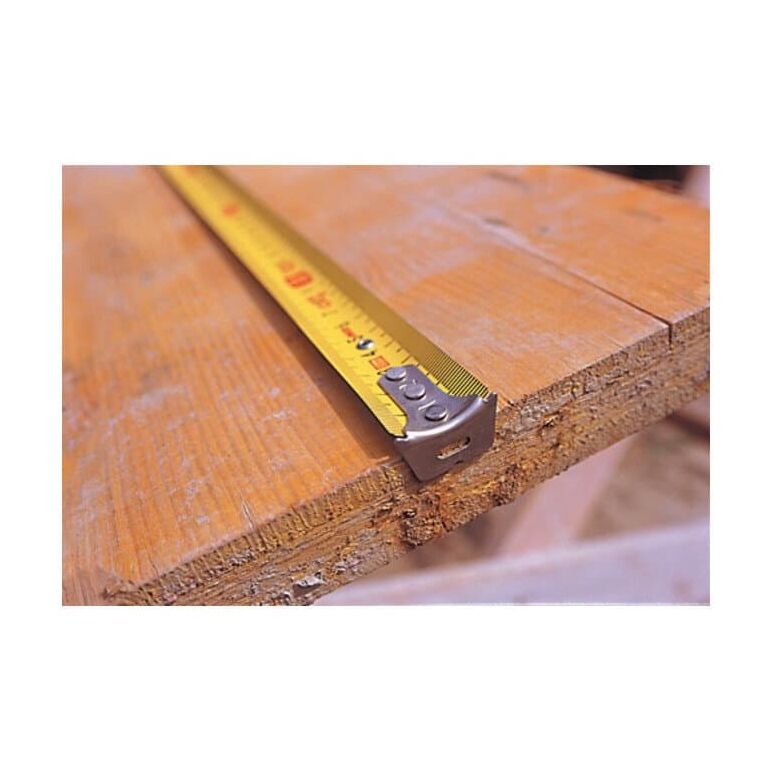 höchste Genauigkeitsklasse · ergonomisch geformtes Gehäuse chromatiert · gleitender Endhaken · zweiteiliger Bandstopp für exakte Einrastung · Stoßdämpfersystem für schonenden Rücklauf · Stahlband gelb lackiert mit Antireflect-Beschichtung · mit Gürtelclip · EG-Genauigkeitsklasse I