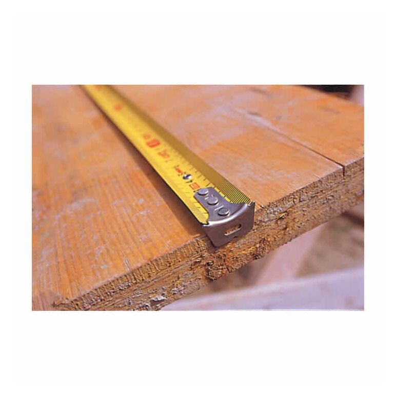 höchste Genauigkeitsklasse · ergonomisch geformtes Gehäuse chromatiert · gleitender Endhaken · zweiteiliger Bandstopp für exakte Einrastung · Stoßdämpfersystem für schonenden Rücklauf · Stahlband gelb lackiert mit Antireflect-Beschichtung · mit Gürtelclip · EG-Genauigkeitsklasse I