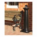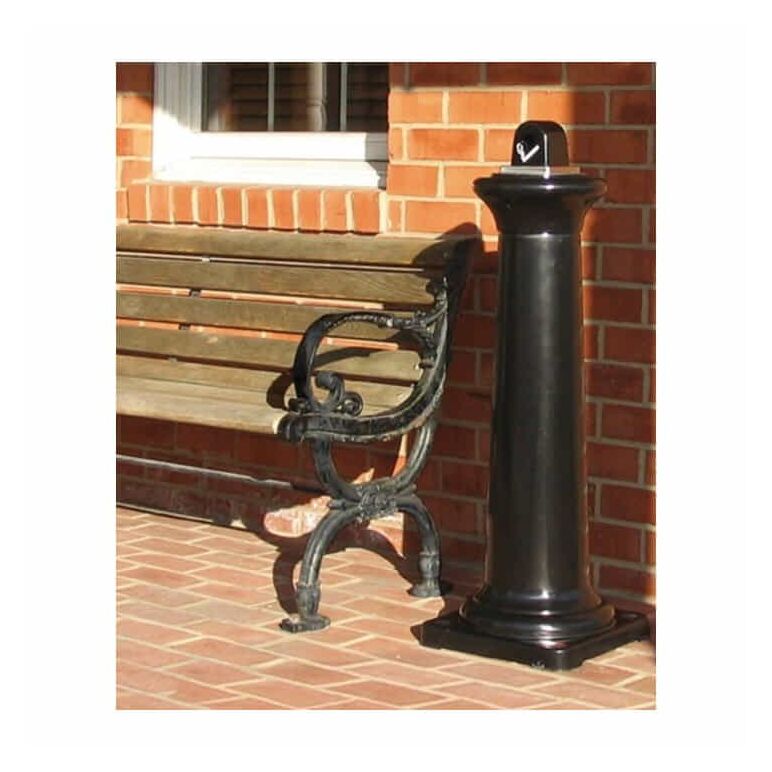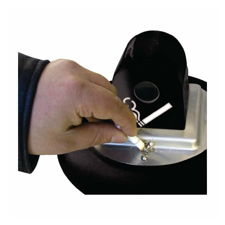 Korpus aus robustem, UV-beständigen Polyethylen, schwarz · Innenbehälter aus galvanisiertem Stahl · Zigaretten-Ausdrückplatte aus Edelstahl · Bodenplatte lässt sich am Boden festschrauben
