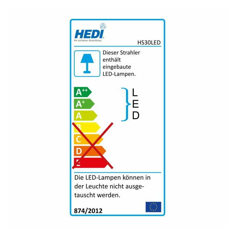 LED-Strahler HEDI "Comfort" 30 Watt im stabilen Tragegestell aus Metall sowie Tragegriff aus Kunststoff. Mit ca. 5 m Anschlussleitung H05RN-F 3G1,0. Technische Eigenschaften der Leuchte: Lichtstrom von 2.500 Lumen bei einem Verbrauch von 30 Watt, Schutzart IP 54, Energieeffizienzklasse A. Für den ständigen Einsatz im Freien.