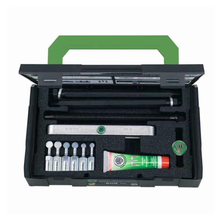 - Abzieher-Set im Kunststoffkoffer bestehend aus jeweils 1 Traverse, 1 Spindel, 2 Zugbolzen und 3 Paar (Gr. 69-A und 69-B) bzw. 6 Paar Ziehstücke (Gr. 69-C)