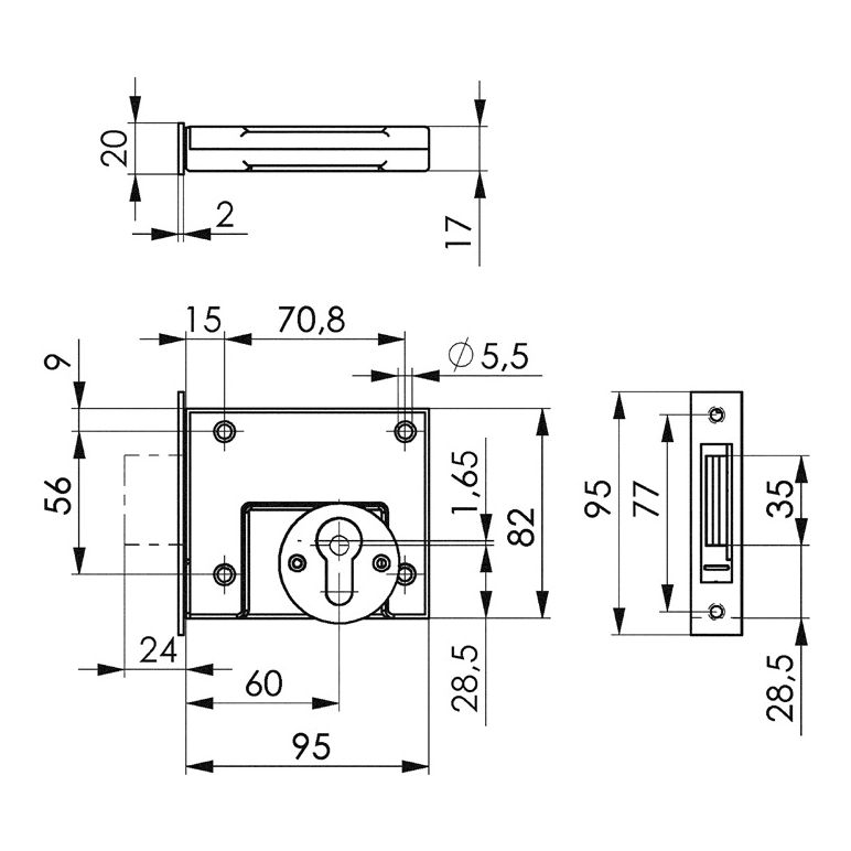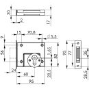 mit flachem Schließblech · verzinkt · rechts und links verwendbar · Riegel aus Zinkdruckguss · Dornmaß 60 mm · Kastenbreite 95 mm · 2-tourig · Zubehör PZ-RosettenWeitere technische Eigenschaften:· Oberfläche: verzinkt· Material: Stahl