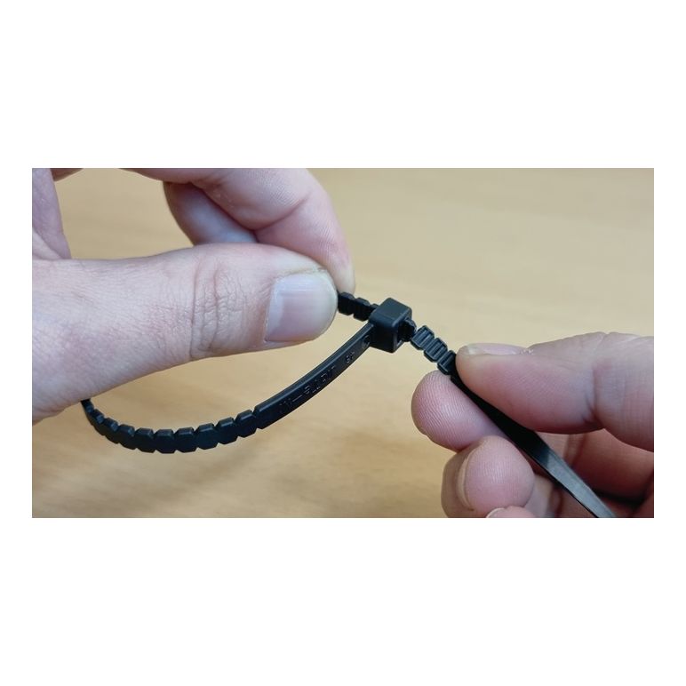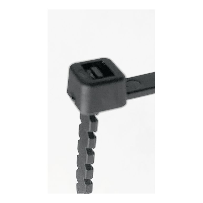 aus Polyamid 6.6 · UV-beständig · einfach abzudrehen · keine scharfe Schnittkante · keine Schere oder Seitenschneider nötig · Zulassungen: nach EN 62275-2019 · Brandprüfung nach UL 94 V-2 · Temperaturbeständigkeit: -30 °C bis +80 °CWeitere technische Eigenschaften:· Mindestabbindekraft: 22kg