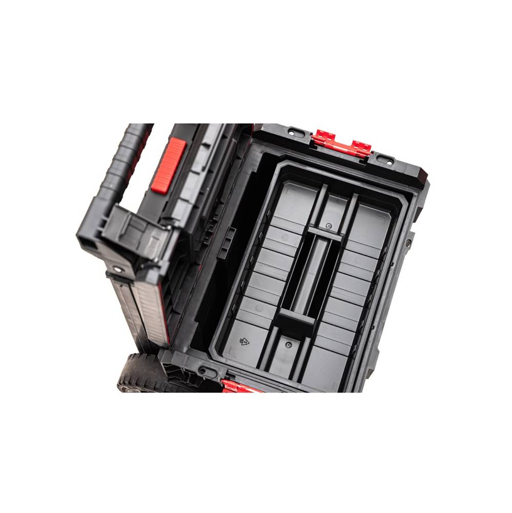 Die mobile Werkzeugkiste ermöglicht den Transport langer Elektrowerkzeuge wie Hammerhämmer, Winkelschleifer oder Betonmischer mit dem nötigen Zubehör. Sie ist mit drei verstellbaren Fächern ausgestattet – darunter ein Multi-Fach, das dank der differenzierten Halterungen für Handwerkszeug für Ordnung im Inneren der Box sorgt. Seine überdurchschnittlichen Abmessungen machen es zu einem einzigartigen Produkt in seiner Kategorie.