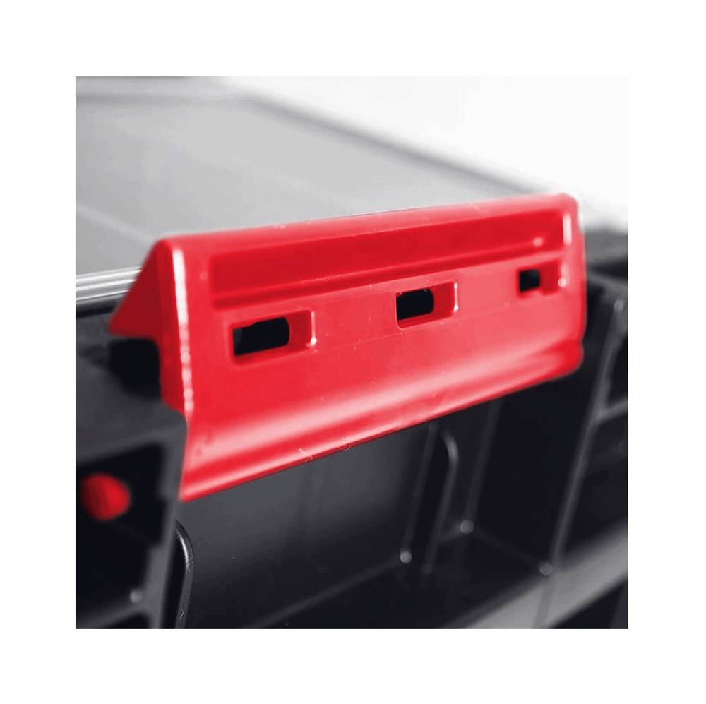 Der Qbrick System PRO Drawer 2 Toolbox Expert ist ein geräumiger, modularer Werkzeugkasten, der mit zwei ausziehbaren Schubladen auf Metallschienen ausgestattet ist. Eine praktische Taste ermöglicht den einfachen Zugriff auf ihren Inhalt. Die Expert-Version der Schubladen ist mit 6 verstellbaren Trennwänden und 10 Fächern ausgestattet, 7 auf der oberen Ebene und 3 tiefe Fächer mit Trennwänden auf der unteren Ebene. Die Fächer auf der oberen Ablage ermöglichen die Organisation von langem und kleinem Werkstattzubehör. Die tiefen Fächer im unteren Regal haben zusätzliche Fächer, drei pro Fach. Die seitlichen Anschlüsse aus Polyamid ermöglichen eine einfache Verbindung mit anderen Modulen der PRO- und ONE-Linien (mit Vario-Abdeckungen und Multi-Adaptern). Dank des komfortablen Griffs lassen sich die Werkzeuge bequem tragen. Die Identifizierung des Inhalts wird durch ein Etikettenfeld gewährleistet, das durch eine Polycarbonatkappe geschützt ist. Eine automatische Schubladensperre, die das Herausziehen der Schubladen verhindert, garantiert einen hohen Komfort der Kommode. RED ULTRA HD ist eine Sonderedition von Qbrick System PRO-Produkten aus ultrabeständigem Kunststoff, der sich durch außergewöhnliche Beständigkeit gegen mechanische Beschädigungen auszeichnet.