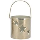 Das Windlicht GROS in silber besteht aus Aluminium und besitzt eine Größe von 13x13x12 cm. Durch die Sternförmigen Details strahlt das Licht eines Teelichts auf eine besondere Art und Weise hindurch.