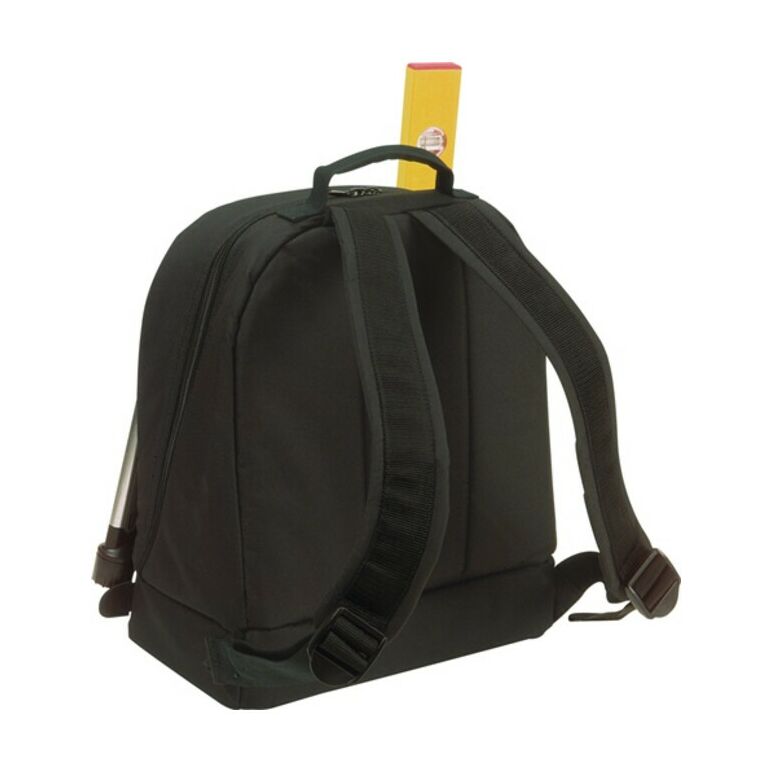 aus verstärktem Spezialstoff · Rückenpolster · mit einstellbaren Schultergurten · doppelter Boden für Kunststoff-Kleinteilebox (im Lieferumfang enthalten) · großes Innenfach mit diversen Einstecktaschen · weitere Außentasche für lange Teile z. B. Wasserwaagen · Material: Polyester