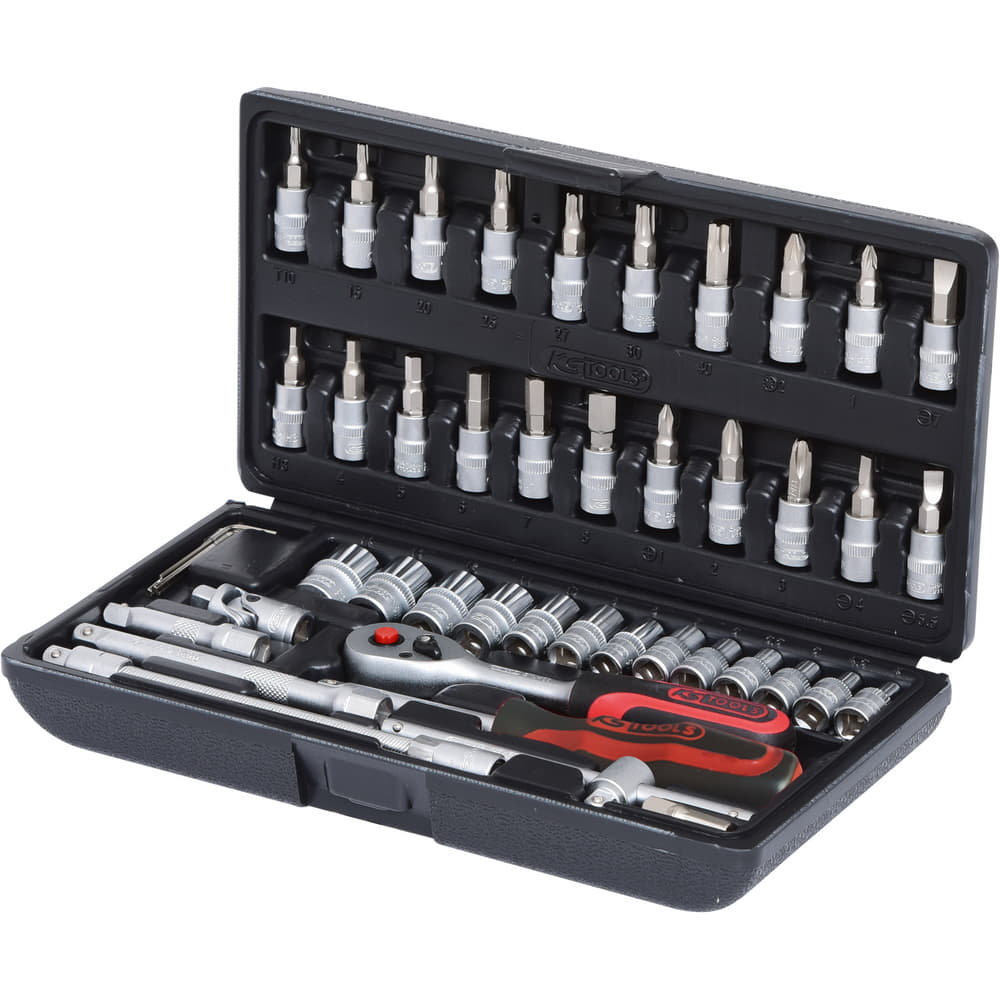 VARIABLE GRUNDAUSSTATTUNG: Der Koffer enthält eine Umschaltknarre 1/4inches inkl. Verlängerung, Adapter, Bits in den gängigen Größen und zwölfkant Steckschlüssel mit UD-Profil.