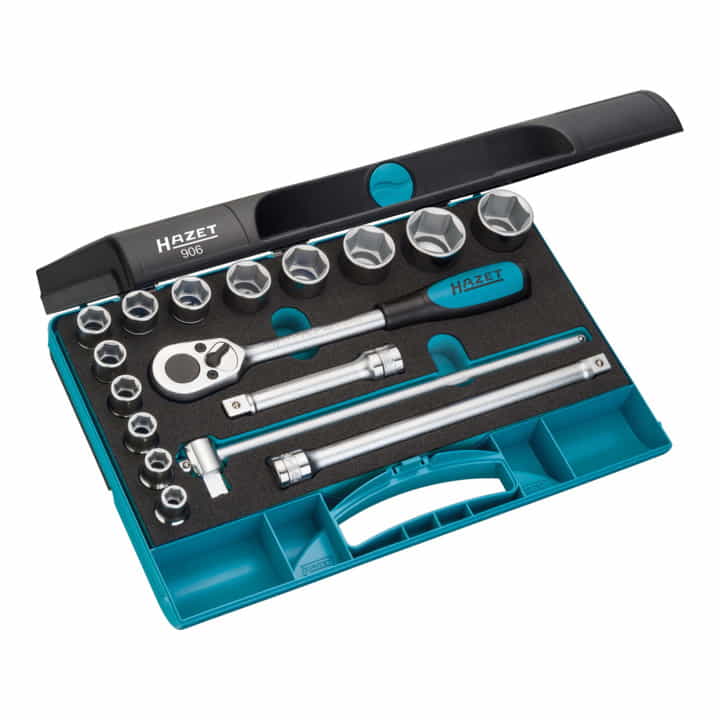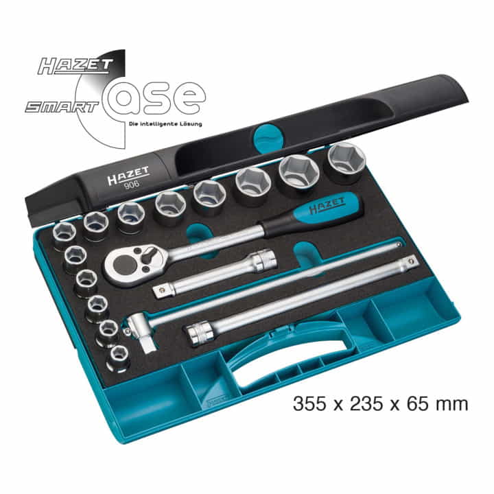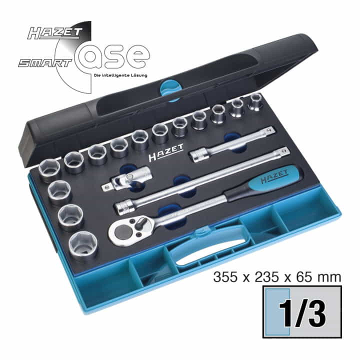 VARIABLE GRUNDAUSSTATTUNG: Der Koffer enthält eine Umschaltknarre 1/2inches inkl. Verlängerung, Adapter, Kardangelenk, Quergriff und sechskant oder zwölfkant Steckschlüssel mit UD-Profil von 10 - 32 mm.
