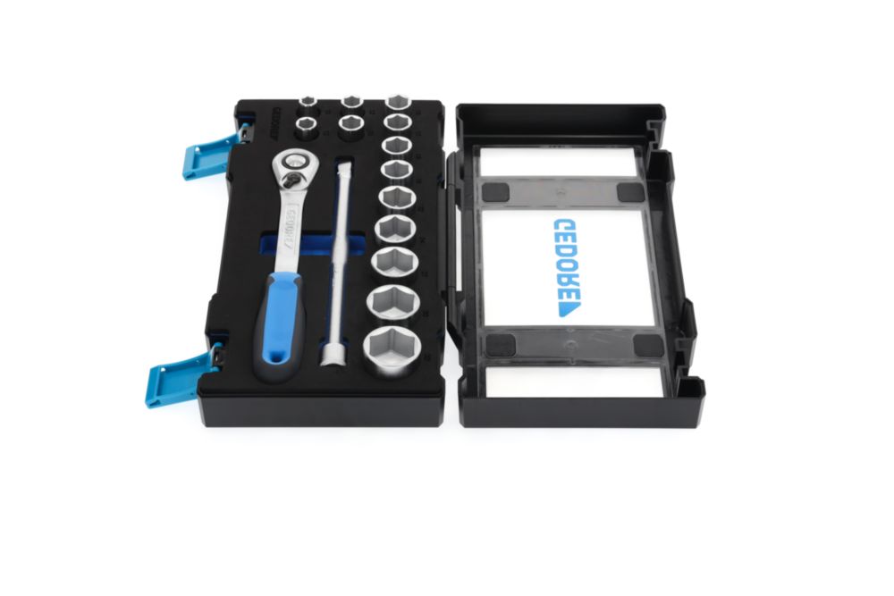 Steckschlüssel-Einsätze und Bedienelemente für die feine Mechanik.