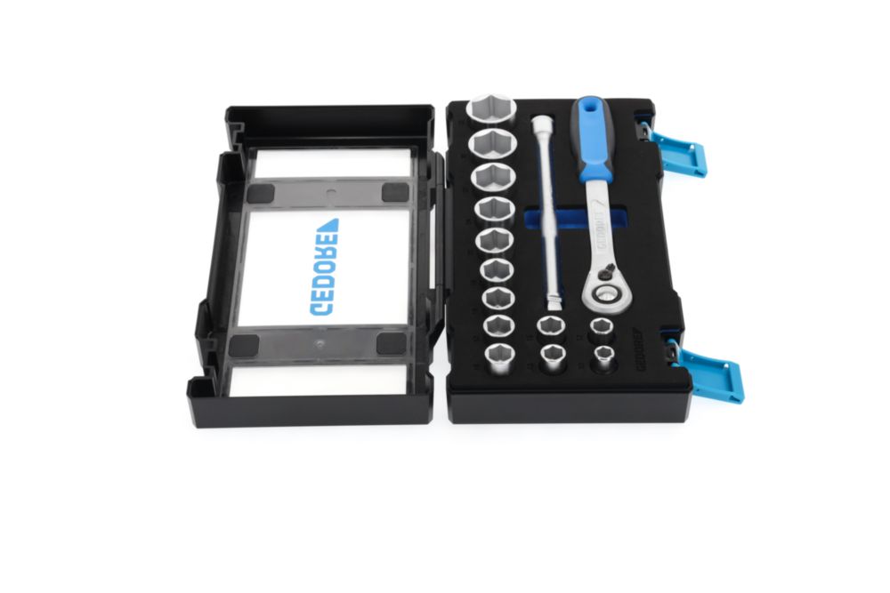 VARIABLE GRUNDAUSSTATTUNG: Der Koffer enthält eine Umschaltknarre 1/2inches inkl. sechskant Steckschlüssel mit UD-Profil von 10 - 24 mm.