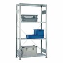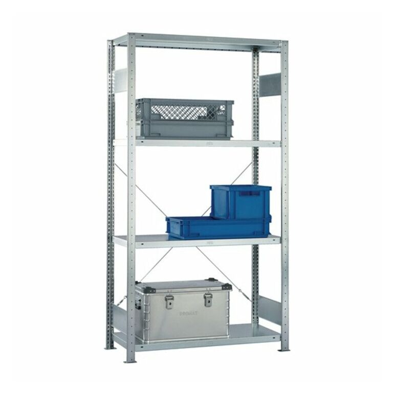 verzinkt · Modulbauweise · schnelle Steckmontage · Fachböden im 25-mm-Raster höhenverstellbar · T-Profilrahmen mit vormontierten Verbindungsblechen · 4 Fachböden mit 150 kg Tragfähigkeit je Boden (bei gleichmäßig verteilter Last), Feldlast 1650 kg Regalaußenmaße: Breite Grundregal + 56 mm, Anbauregal + 6 mm, Tiefe + 36 mm Weitere technische Eigenschaften: · Oberfläche: verzinkt · prüfpflichtig: ja