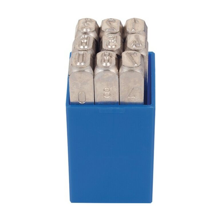 extra schwere Qualität 9 teilig · zur Kennzeichnung von Werkstücken mit einer Festigkeit bis zu 1300 N/mm² (42 HRC) · Härte an der Gravur: 58-61 HRc · mit Sichtgravur auf jedem Stempel · maschinengraviert · Schriftbild nach DIN 1451 · aus Werkzeugstahl, vernickelte Oberfläche · in Kunststoffbox · besonders geeignet für die Kennzeichnung von Edelstählen, da die vernickelte Oberfläche keinen Fremdrost hinterlässt Weitere technische Eigenschaften: · Inhalt: 9-teilig · Ausführung: Zahlen 0 - 9 · Verpackung: in Kunststoffbox