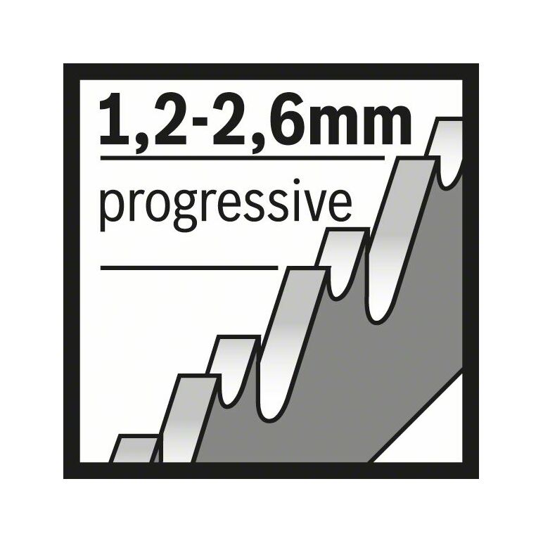 Das T 123 XF Progressor for Metal Stichsägeblatt ist bruchfest und macht schnelle gerade Schnitte in dünnes und starkes Metall. Die Zahngeometrie mit progressiv ansteigender Zahnteilung ermöglicht die Arbeit mit Materialien mit unterschiedlichen Dichten. Die gefrästen, gewellten Zähne sind für schnelle Schnitte in Metallblech konzipiert. Die Zahnleiste aus gehärtetem HSS (Hochgeschwindigkeitsstahl) und BIM ist mit hochelastischem HCS verstärkt, wodurch das Bruchrisiko reduziert wird, und sowohl genügend Festigkeit als auch die Flexibilität geboten werden, um perforiertes Metallblech aus Stahl (Standard-Stärke) zu schneiden. Das Stichsägeblatt ist mit einer feinen progressiven Zahnteilung (1,2-2,6 mm) ausgestattet und schneidet viele starke und dünne Metallbleche mit einer Dicke von 1,5-10 mm. Für den Gebrauch mit Stichsägen mit T-Schaft-Aufnahme. Werkstoff: HSS, Zahnausführung: geschränkt, gefräst, Gesamtlänge [mm]: 100, Zahnteilung [mm]: 1,2-2,6, Einsatzbereiche: dünne bis starke Bleche (1,5-10 mm), Rohre + Profile, inkl. Alu (ø <30 mm), Progressiv, Typ: T 123 X.