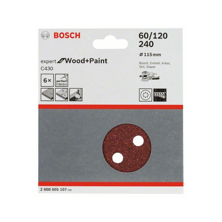 Bosch Schleifblatt C430, 115 mm, 60, 120, 240, 8 Löcher, Klett, 6er-Pack (2 608 605 107)
