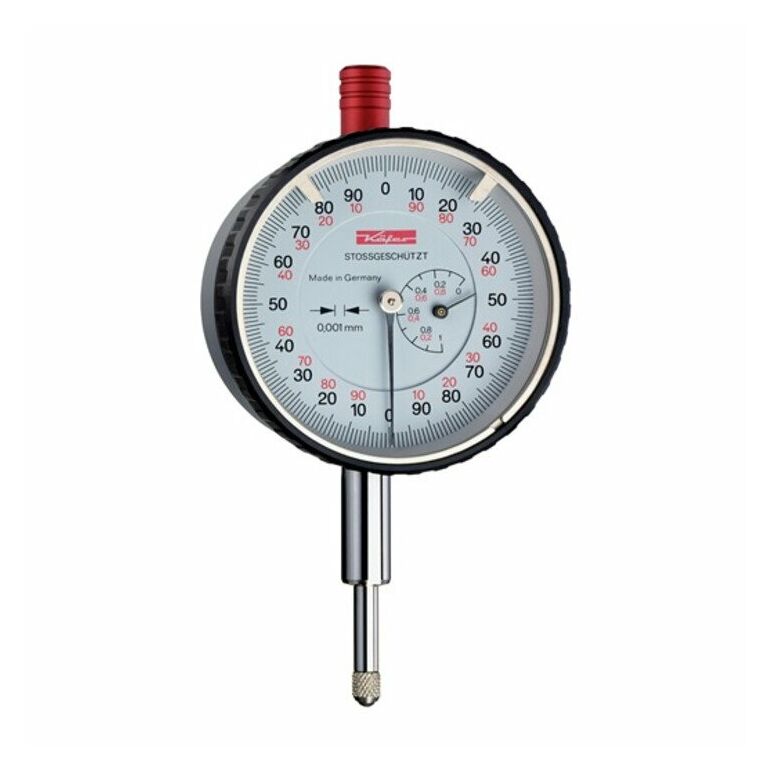 (Feinmessuhr) · mit Stoßschutz · Abmessungen nach DIN EN ISO 463 · Einspannschaft (Ø 8 mm h6) und Messbolzen aus nichtrostendem Stahl · verstellbare Toleranzmarken · Präzisions-Zahnradmesswerk mit hoher Auflösung des Messwertes · Außenring-Ø 58 mm · Messbereich: 5 mm · Ablesung: 0,001 mm