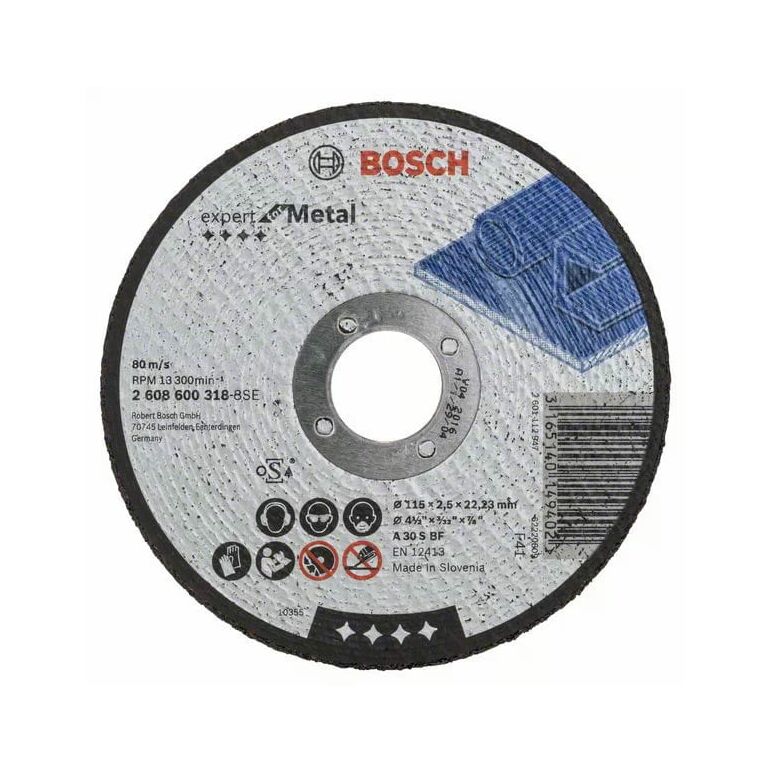 Die Trennscheibe Expert for Metal kombiniert enorme Trennleistung in Metall mit maximaler Sicherheit. Die Scheibe aus Premium-Aluminiumoxid mit hochwertiger Phenolharzbindung eignet sich für anspruchsvolle Anwendungen und erzielt gute Ergebnisse. Zudem sorgt das präzisionsgefertigte Glasfasergewebe für hohe Stabilität und Sicherheit beim Schneiden. Verwenden Sie diese Scheibe zum Schneiden von Metall. Für Winkelschleifer. Trennscheiben von Bosch erfüllen die höchsten Sicherheitsanforderungen wie EN 12413, FEPA und oSa. Spezifikation: A 30 R BF, Durchmesser mm: 300, Bohrungsdurchmesser mm: 22,23, Dicke mm: 3,2.