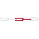 Kunststoffketten aus Polyethylen Achtung: Kunststoffketten und Zubehör dürfen keiner ständigen Belastung ausgesetzt werden, sie dienen ausschließlich als Sichtketten! weitere Info's: Ø: 6,0 mm T: 42,0 mm AB: 20,0 mm Farbe: rot-weiß Bund: 3,00 kg Bund:: 50 m Marke: PÖSAMO