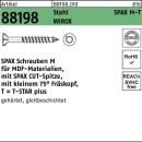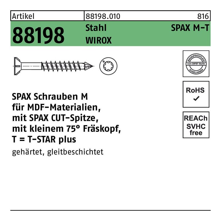 Artikel 88198 Stahl SPAX M-T Oberfläche WIROX SPAX Schrauben M für MDF-Materialien · mit Spitze · mit kleinem 75° Fräskopf - Abmessung: 4 x 50/35-T20 VE=K (200 Stück)Weitere technische Eigenschaften:· Gruppencode 88198.010· Normart REYHER-Artikel 88198